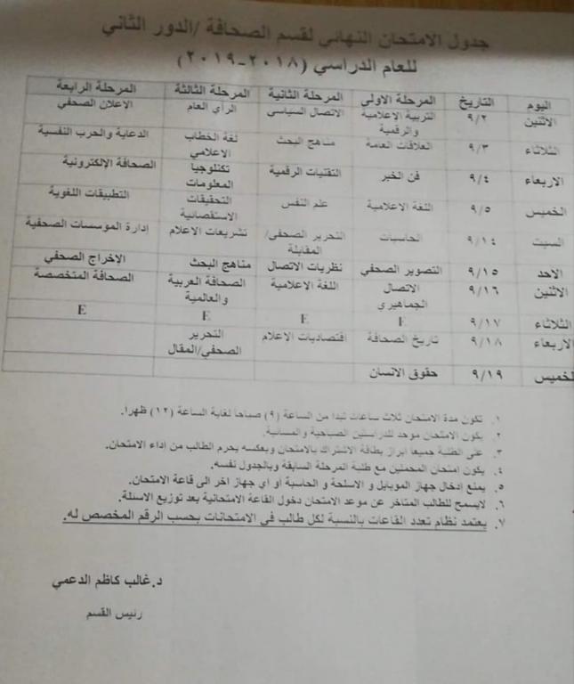 جدول الامتحانات النهائية (الدور الثاني) لقسم الصحافة وللمراحل كافة