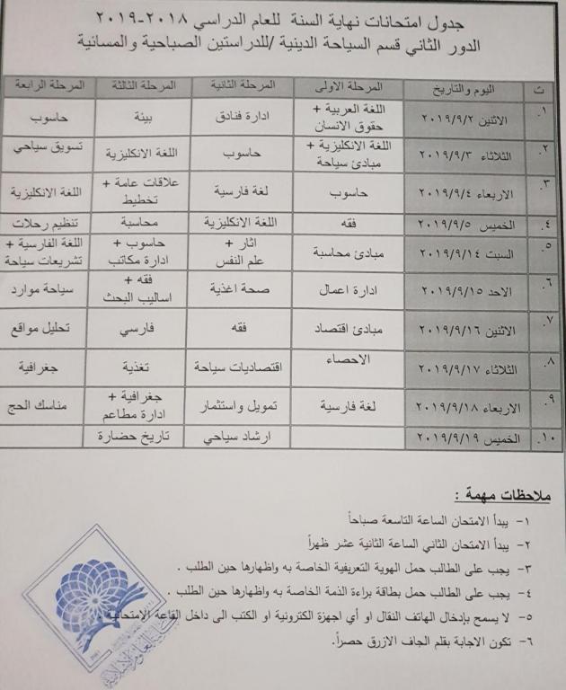 Welcome الرئيسية كلية العلوم الاسلامية قسم السياحة الدينية قسم السياحة الدينية جدول الامتحانات النهائيه الدور الثاني لقسم السياحه الدينيه للعام الدراسي 2018-2019 sabah@itc