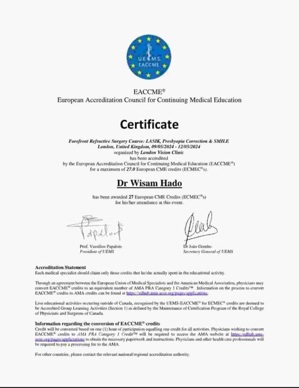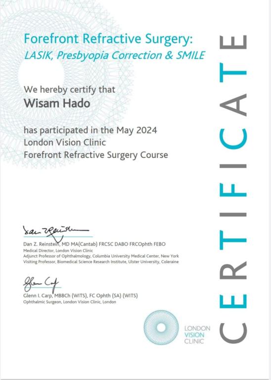 وقد تم التدريب على احدث واخر التقنيات العالمية في مجال تصحيح البصر خاصة عمليات الفيمتو ليزك وتقنية السمايل الأحدث عالميا.