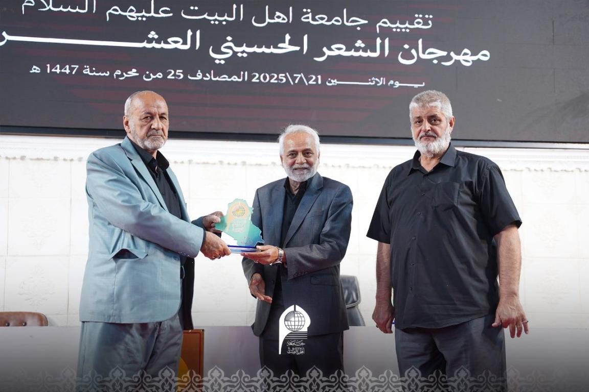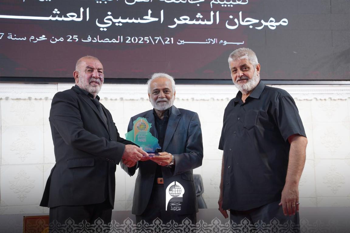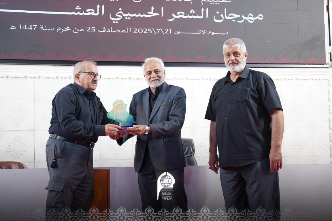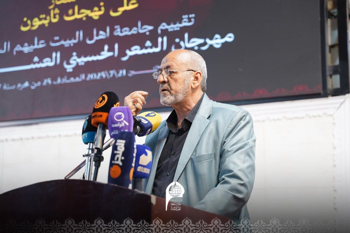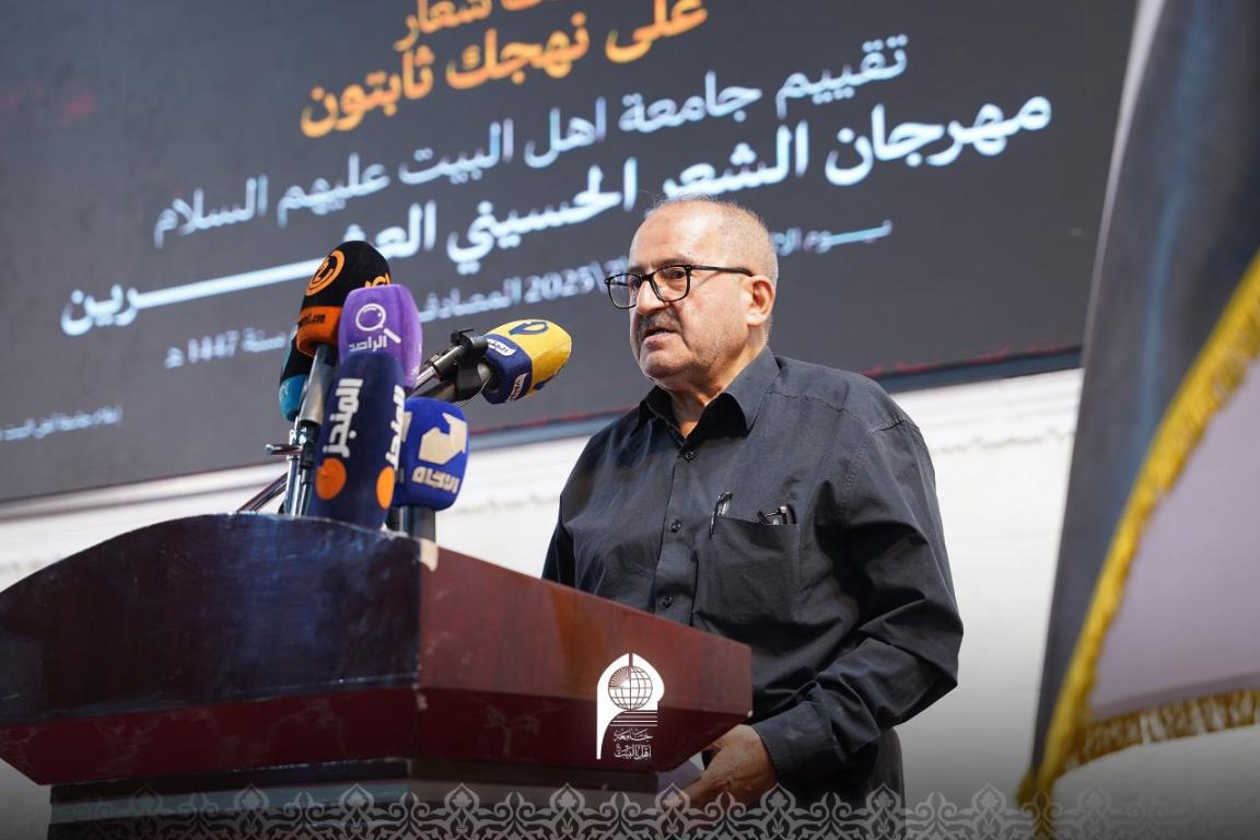 في ذكرى استشهاد الأمام علي بن الحسين عليهما السلام ،اقامت جامعة اهل البيت عليهم السلام مهرجان الشعر الحسيني العشرين تحت شعار ( على نهجك ثابتون ) على قاعة الاحفالات الكبرى في الجامعة ،وابتدأ الحفل بتلاوة إيات من الذكر الحكيم تلاها المقرئ الدكتور مصطفى ،بعدها قرأ الحضور سورة الفاتحة على ارواح شهداء الطف وشهداء الأمة الاسلامية وشهداء العراق كافة،،ثم تقدم الاستاذ الدكتور محسن القزويني مؤسس جامعة اهل البيت عليهم السلام بكلمة تاريخية مهمه تحدث خلالها عن اهمية الشعر خلال العصور وبالاخص في العصر الاسلامي وما له من دور اعلامي مهم في ذكر الاحداث وارشفتها ،حيث كان يطلق على الشعر بلسان العرب ،وكيف كان للشعر دور في حفظ الاحداث المهمه التي مرت بها الامم الموالية لاهل البيت عليهم السلام عبر التاريخ وحفظ الملاحم والوقائع التي ساهمت بثبات الموالين على نهج اهل البيت عليهم السلام ومقاومتهم ومقارعتهم للظلم والاضطهاد ونصرتهم للمظلوم أينما كان ،،والتمسك بالقضية رغم كثرة الأعداء والحاقدين ،واختتم حديثه بقراءة قصيده ملحميه حسينية ، وشارك في المهرجان كل الأدباء : الشاعر عوده ضاحي التميمي الشاعرة أمل الخفاجي الشاعر مهدي هلال الكربلائي الشاعر سعد العصامي الاستاذ صادق جعفر القزويني الاستاذ الدكتور عبود جودي الحلي كما ساهم الشاعر المبدع الكبير ،الاستاذ رضا الخفاجي بابيات شعرية ارسلها للسيد صادق القزويني قرأها نيابة عنه ،كمساهمة منه ولكي لا ينقطع عن المشاركة كما في كل عام ،،كونه يعاني من ظروف صحية قاهرة،، حيث دعا له جميع الحاضرون بالشفاء العاجل ببركة الأمام الحسين عليه السلام ،، وحضر المهرجان نخبة من عمداء الكليات الاجلاء واساتذها الكرام ،وجمع من الضيوف واداريي الجامعة