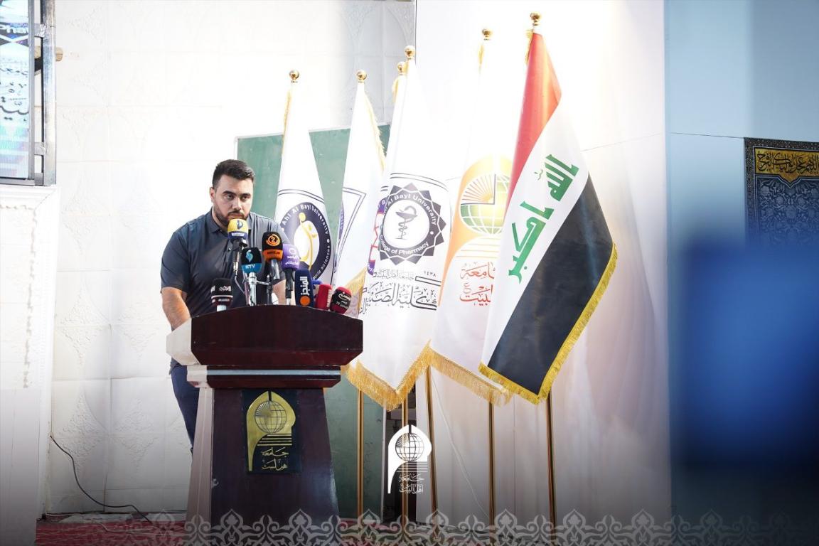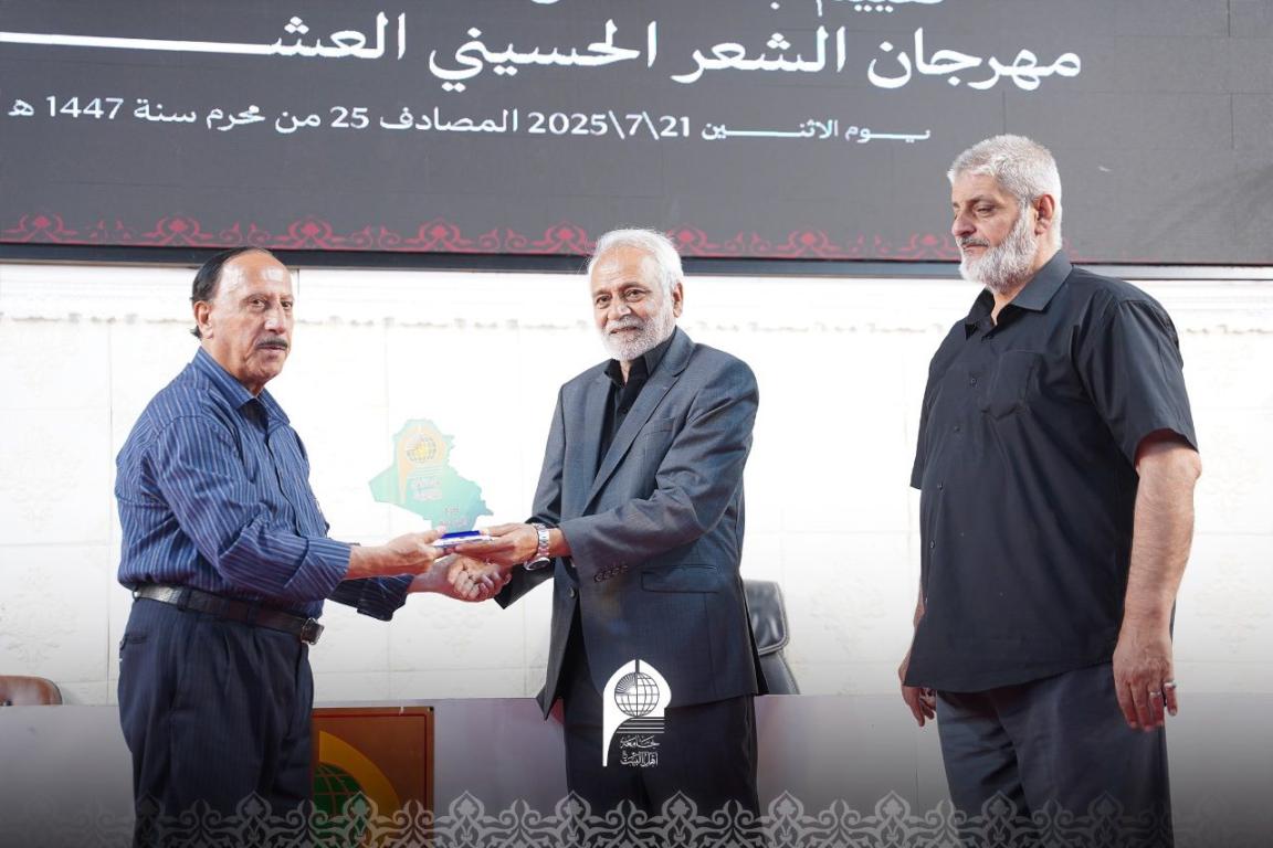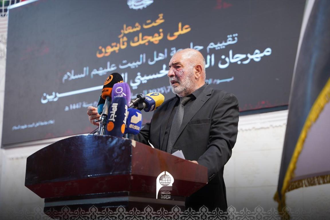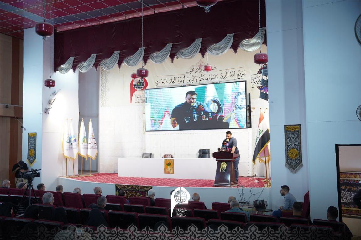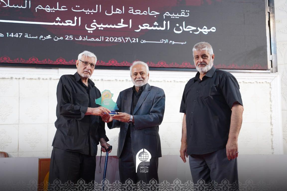 في ذكرى استشهاد الأمام علي بن الحسين عليهما السلام ،اقامت جامعة اهل البيت عليهم السلام مهرجان الشعر الحسيني العشرين تحت شعار ( على نهجك ثابتون ) على قاعة الاحفالات الكبرى في الجامعة ،وابتدأ الحفل بتلاوة إيات من الذكر الحكيم تلاها المقرئ الدكتور مصطفى ،بعدها قرأ الحضور سورة الفاتحة على ارواح شهداء الطف وشهداء الأمة الاسلامية وشهداء العراق كافة،،ثم تقدم الاستاذ الدكتور محسن القزويني مؤسس جامعة اهل البيت عليهم السلام بكلمة تاريخية مهمه تحدث خلالها عن اهمية الشعر خلال العصور وبالاخص في العصر الاسلامي وما له من دور اعلامي مهم في ذكر الاحداث وارشفتها ،حيث كان يطلق على الشعر بلسان العرب ،وكيف كان للشعر دور في حفظ الاحداث المهمه التي مرت بها الامم الموالية لاهل البيت عليهم السلام عبر التاريخ وحفظ الملاحم والوقائع التي ساهمت بثبات الموالين على نهج اهل البيت عليهم السلام ومقاومتهم ومقارعتهم للظلم والاضطهاد ونصرتهم للمظلوم أينما كان ،،والتمسك بالقضية رغم كثرة الأعداء والحاقدين ،واختتم حديثه بقراءة قصيده ملحميه حسينية ، وشارك في المهرجان كل الأدباء : الشاعر عوده ضاحي التميمي الشاعرة أمل الخفاجي الشاعر مهدي هلال الكربلائي الشاعر سعد العصامي الاستاذ صادق جعفر القزويني الاستاذ الدكتور عبود جودي الحلي كما ساهم الشاعر المبدع الكبير ،الاستاذ رضا الخفاجي بابيات شعرية ارسلها للسيد صادق القزويني قرأها نيابة عنه ،كمساهمة منه ولكي لا ينقطع عن المشاركة كما في كل عام ،،كونه يعاني من ظروف صحية قاهرة،، حيث دعا له جميع الحاضرون بالشفاء العاجل ببركة الأمام الحسين عليه السلام ،، وحضر المهرجان نخبة من عمداء الكليات الاجلاء واساتذها الكرام ،وجمع من الضيوف واداريي الجامعة