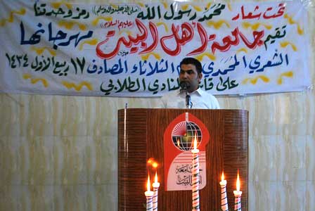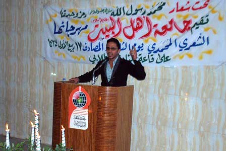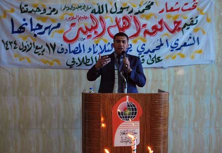 تحت شعار محمد صلى الله عليه وآله وسلم رمز وحدتنا أقام طلبة جامعة أهل البيت عليهم السلام كلية الشريعة الإسلامية مهرجاناً شعرياً بهذه المناسبة وقد القى الطلبة قصائدهم في مديح النبي الأكرم حيث توالى على المنصة كل من الطلبة علي الابراهيمي، ياسين عمران، محمد الحلفي، حامد الخالدي، عبدالهادي الكربلائي، حيدر الياسري، وألقوا قصائدهم بهذه المناسبة العزيزة.