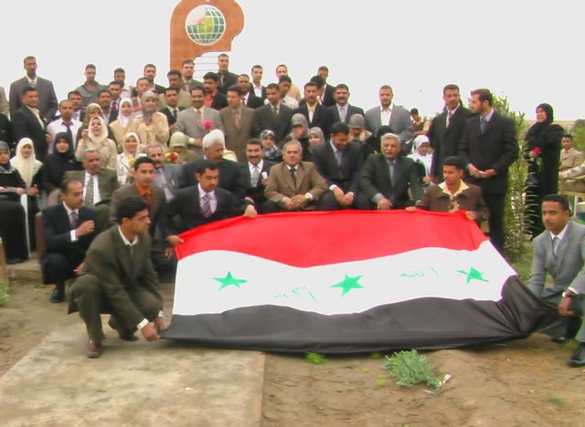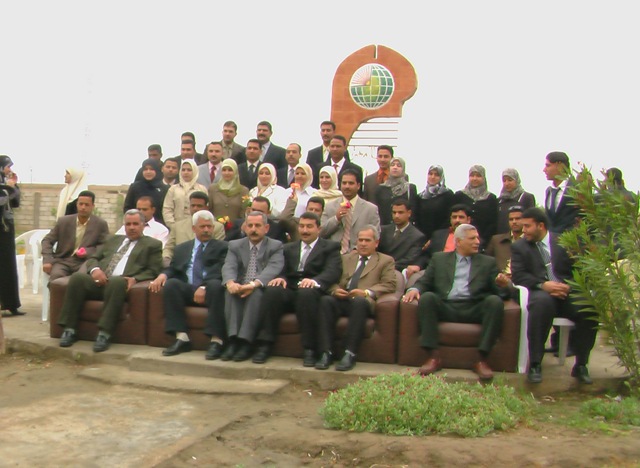 طلبلة المرحلة الرابعة يحتفلون بتخرجهم ويلتقطون الصور الجماعية في ساحة الجامعة مع أساتذتهم.
