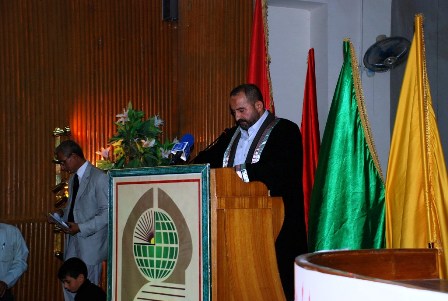 واشاد السيد المحافظ بدور السيد مؤسس جامعة اهل البيت الدكتور محسن القزويني في مجال البحوث والدراسات وخص بالذكر دراسة مقومات الامن الاجتماعي في الاسلام وآليات تحقيقه. بعدها القى الاستاذ الدكتور عبود جودي الحلي رئيس جامعة اهل البيت كلمة رحب فيها بالحاضرين وهنأ فيها الطلبة الخريجين وتطرق في كلمته لتاريج الجامعة وسعيها لتحقيق الاهداف العلمية والتربوية واهمها المستوى العلمي في محافظة كربلاء المقدسة وصولا لمستقبل هذا البلد العزيز وحرص الجامعة على اتاحة فرصة التعليم الجامعي لمن حرم منها كما تحدث السيد رئيس الجامعة عن مباشرة الجامعة بالاخذ باسباب التطور العلمي في توفير منظومة شبكة المعلومات العلمية واقامت موقع لها على شبكة المعلومات يتضمن اخبار الجامعة وانشطتها ومحاضرات اساتذتها ومن اجل تلبية الحاجة الفعلية استحدثت الجامعة قسم الصحافة لاعداد جيل متخصص في عرض معاناة شعبنا وفضح اعدائه كما استحدثت الجامعة قسما للسياحة الدينية يتكفل بتهيئة مواطنين يشعرون بالانتماء الصادق لبلدهم انتماءا يجعلهم يرحبون بزواره ويتخذون من العناية بهم وتقديم التسهيلات مهنة يمارسونها بتخصص وعلمية. كما بين الحلي اهتمام ديننا الاسلامي الحنيف وجعلة من طلب العلم فريضة على المسلمين جميعا . واشار الى ان الجامعة ستسير على طريق التقدم والتطور وتقدم بشكره للسيد محافظ كربلاء لرعايته حفل التخرج .