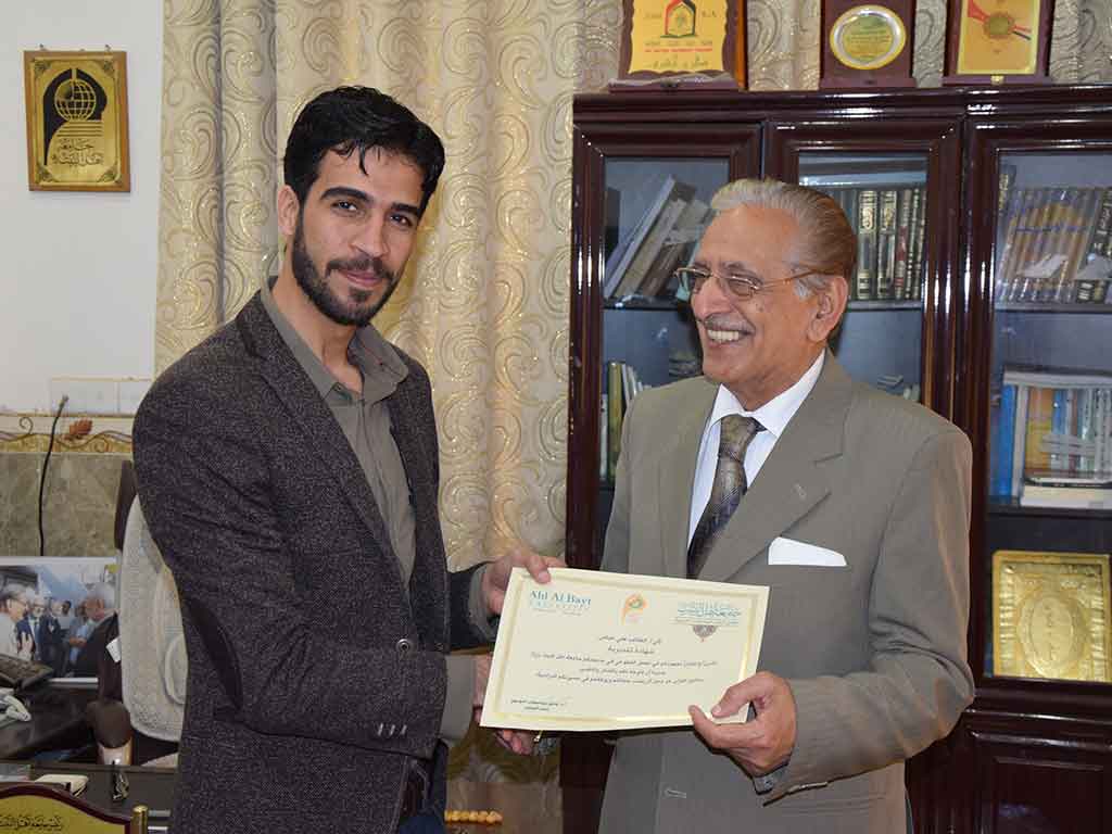 كرم السيد رئيس جامعة اهل البيت عليهم السلام الاستاذ الدكتور صادق الموسوي عدد من طلبة المرحلة الاولى من قسم الصحافة بشهادات تقدير تكريما للاعمال التطوعية التي قدموها للجامعة هذا و قد اكد السيد رئيس الجامعة على ان الجامعة تدعم مثل هذه الطاقات الشبابية التي لها الدور الكبير في تنمية روح التعاون بين الطلبة