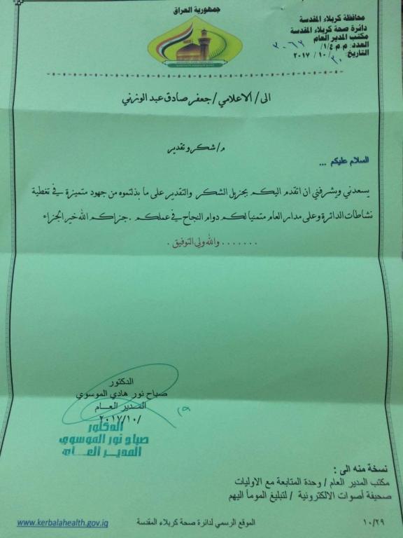 كرم عميد كلية الاداب في جامعة اهل البيت عليهم السلام الدكتور باقر الزجاجي الطالب جعفر الوزني المراسل الخاص بصحيفة اصوات الالكترونية التابعة لقسم الصحافة في جامعة اهل البيت عليهم السلام هذا و قام رئيس قسم الصحافة في الجامعة الدكتور غالب الدعمي بتكريم الطالب ايضا لدوره الفعال في الصحيفة في تغطية مراسيم زيارة الاربعين بشكل مستمر و اثنى على دوره المتميز ومن الجدير بالذكر ان صحيفة اصوات الالكترونية حصلت على كتاب شكر وتقدير من دائرة صحة كربلاء لمساهمتها الفعالة في نقل الاخبار التي تخص مدينة كربلاء خلال الزيارة الاربعينية
