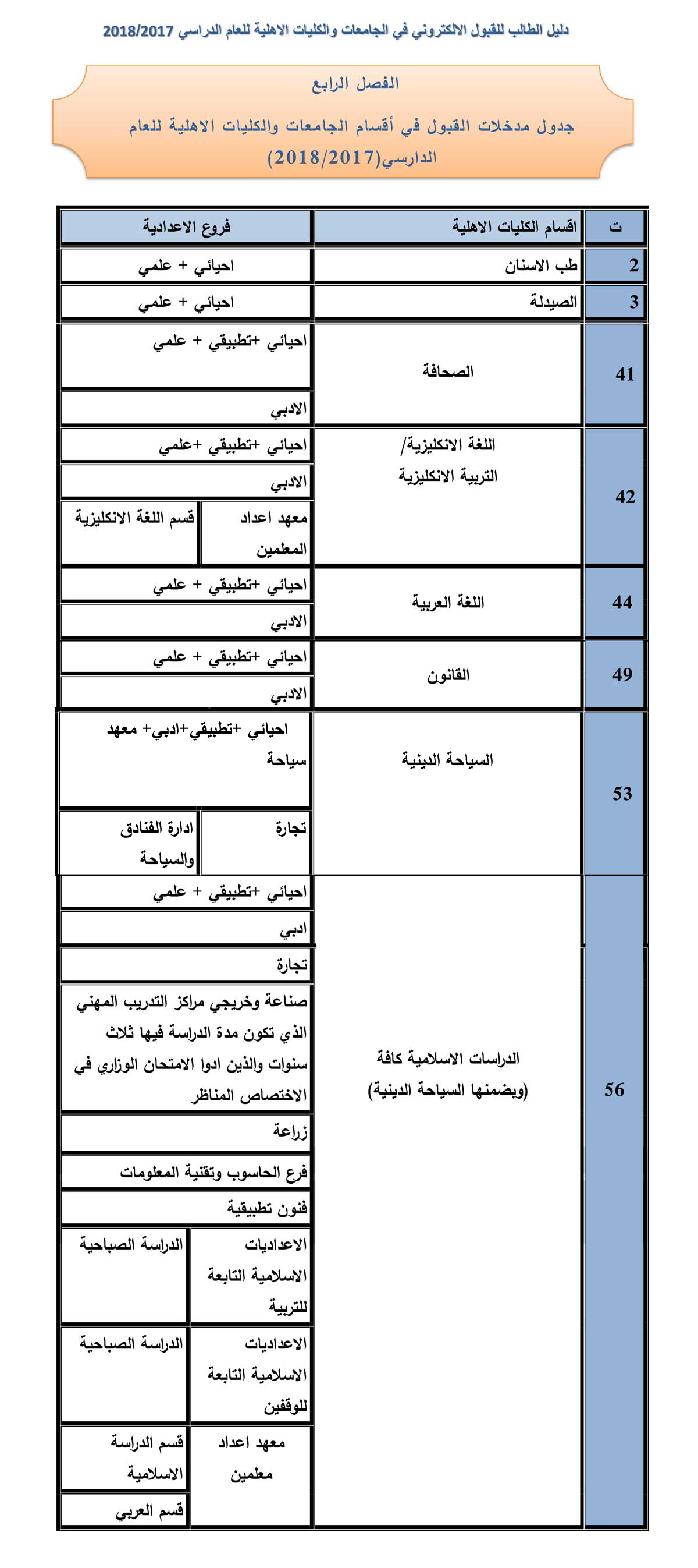 الحد الأدنى للقبول في كليتا طب الأسنان والصيدلة هو 85 لخريجي فرعي الأحيائي والعلمي وفي كلية القانون 60 لخريجي العلمي والاحيائي والتطبيقي والأدبي.