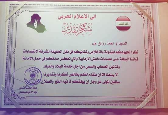 حصل الطالب احمد رزاق جبر من قسم الصحافة في جامعة اهل البيت عليهم السلام على شهادة تقديرية من هيأة الحشد الشعبي بمناسبة النصر العظيم الذي حققه الجيش العراقي و الحشد الشعبي ولدوره المتميز في الاعلام الحربي و مشاركته الفعالة في نقل الحقيقة المشرفة لأنتصارات القوات الامنية والحشد الشعبي على عصابات داعش الارهابية حيث تم تكريم عدد من الاعلاميين الحربيين في ناحية تازة في مهرجان كان تحت شعار ( لولا فتوى السيد السيستاني لما كان العراق خاليا من الارهاب ) و من الجدير بالذكر ان لجامعة اهل البيت عليهم السلام مشاركة واضحة في تقديم الدعم اللوجستي للقوات الامنية والحشد الشعبي وهي اول من اسس الحشد الجامعي الذي شارك في هذا الانتصار العظيم وساهم في دحر الارهاب خارج الاراضي العراقية