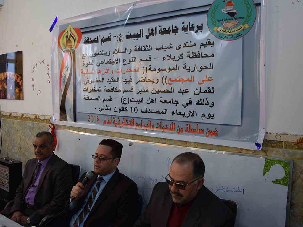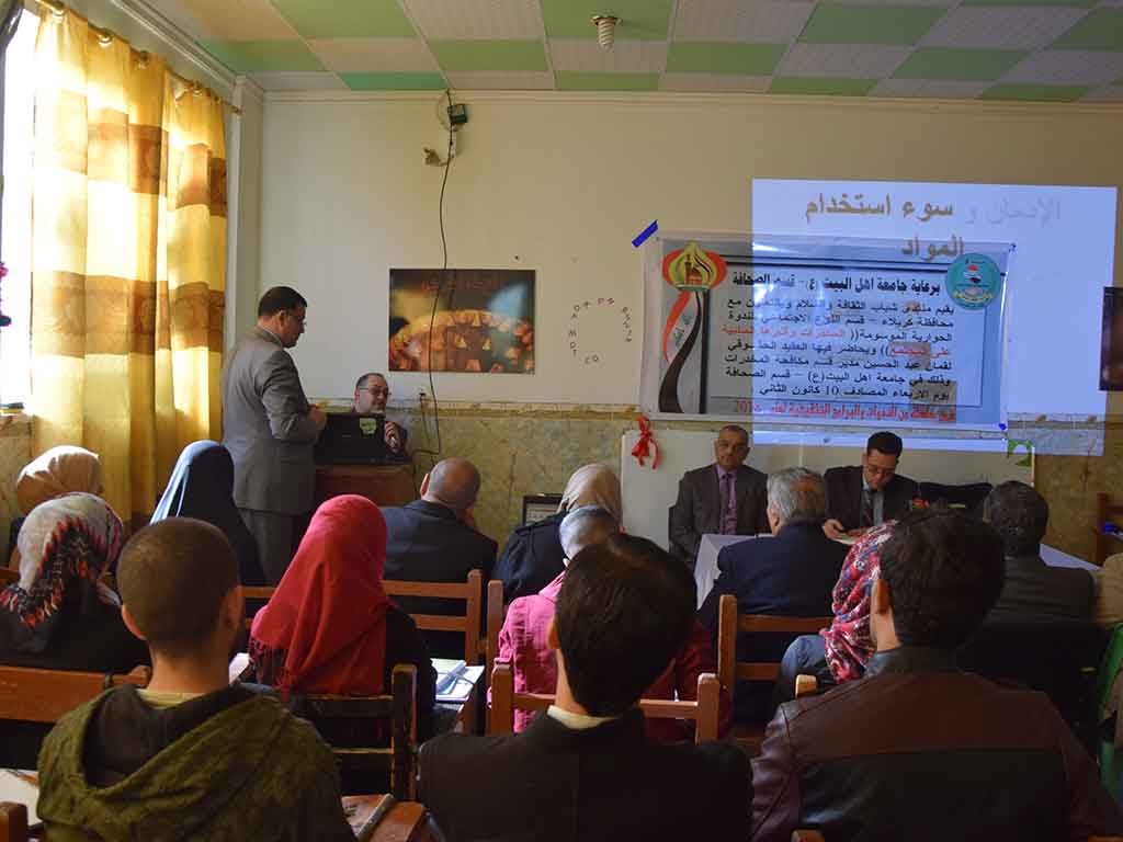 نظم قسم الصحافة ندوة بشأن انتشار المخدرات وسبل معالجتها بحضور رئيس جامعة اهل البيت عليهم السلام الاستاذ الدكتور صاحب الأطرقجي وحاضر فيها كل من الدكتور عامر الحيدري إستاذ الصحة النفسية في جامعة كربلاء، والعقيد لقمان عبد الحسين مدير قسم المخدرات في مكتب مكافحة كربلاء. وتطرق الدكتور الحيدري إلى مخاطر تعاطي المخدرات بأنواعها وانتشارها في المجتمع العراقي والسبل الكفيلة بمعالجتها والتخفيف من آثارها الصحية والنفسية على المتعاطين، في حين تحدث العقيد لقمان بشأن اجراءات قسم مكافحة المخدرات في الحد من انتشار هذه الظاهرة في المجتمع الكربلائي، وقدم بعض الاحصائيات المتصلة بهذا الشأن كاشفا عن وجود أكثر من ألف مقهى في المحافظة غير مسيطر عليها بشكل كامل ولا نجزم خلوها من المواد المخدرة.