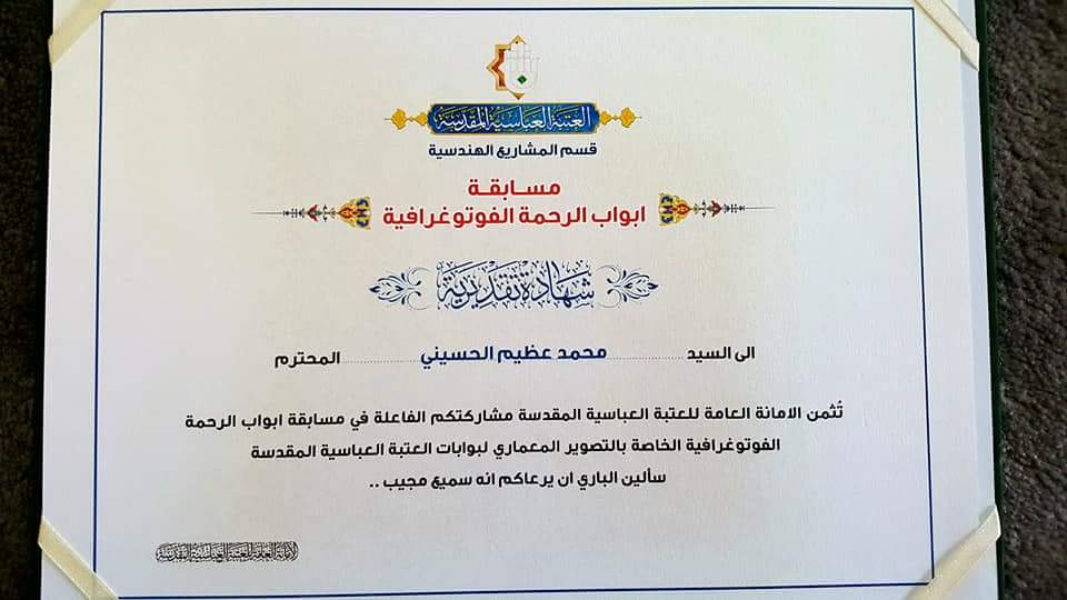 كرم قسم المشاريع الهندسية التابع للعتبة العباسية المقدسة الطالب محمد عظيم الحسيني الذي يدرس في قسم الصحافة بجامعة اهل البيت عليهم السلام و الذي حصل على مرتبة متقدمة في مسابقة ابواب الرحمة الفوتوغرافية التي اقامتها العتبة العباسية المقدسة و قد شارك في المسابقة عدد كبير من المصورين من داخل العراق