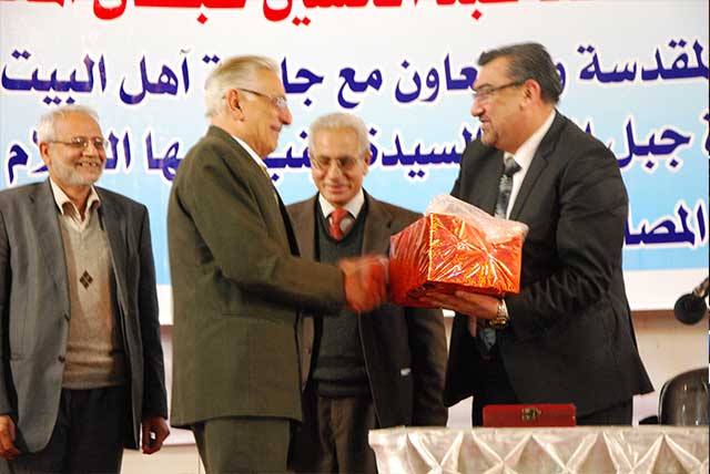 وفي ختام القاء الذي اتسم بالحيوية والصراحة قدم السيد الدكتور محسن القزويني درع الجامعة للأستاذ خليل الطيار ثم قدم السيد رئيس الجامعة مجموعة من الكتب الثقافية هدية تقديرية له..