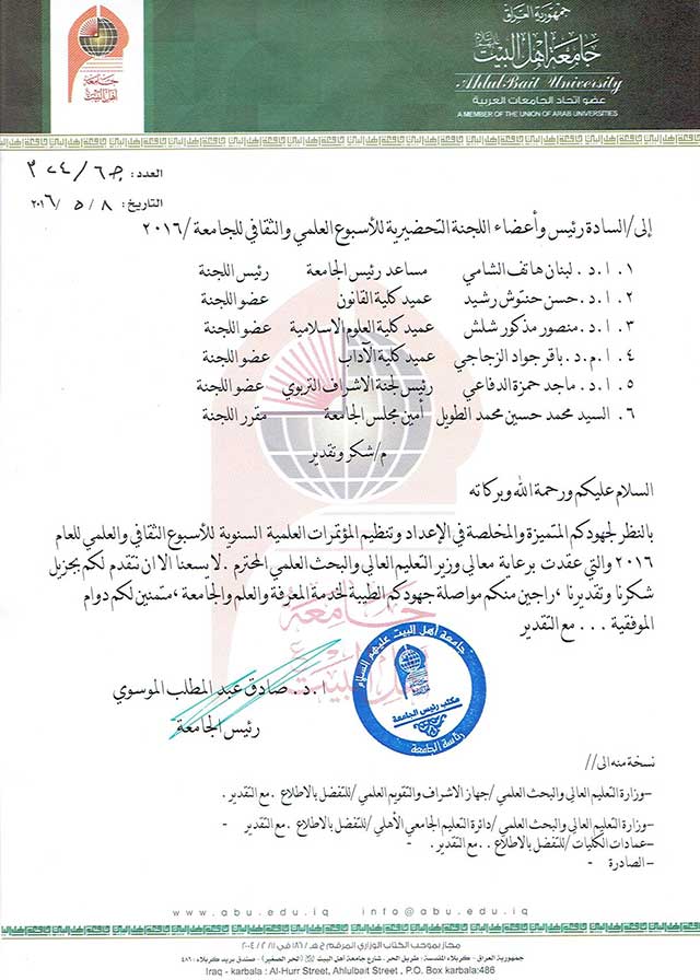 لمناسبة انتهاء فعاليات الأسبوع العلمي والثقافي للجامعة للعام 2016 والتي تضمنت عقد المؤتمرات العلمية السنوية لكليات الجامعة وعقد ندوة حوارية بالتنسيق مع هيئة النزاهة وانتخاب الطالب المثالي للجامعة وأداء قسم التخرج للطلبة الخريجين وللجهود المخلصة التي بذلها السيد رئيس اللجنة التحضيرية المركزية للمهرجان السنوي الأستاذ الدكتور لبنان هاتف الشامي مساعد رئيس الجامعة والسادة أعضاء اللجنة وجه السيد رئيس جامعة أهل البيت عليهم السلام شكره وتقديره لهم لجهودهم واداءهم المخلص.