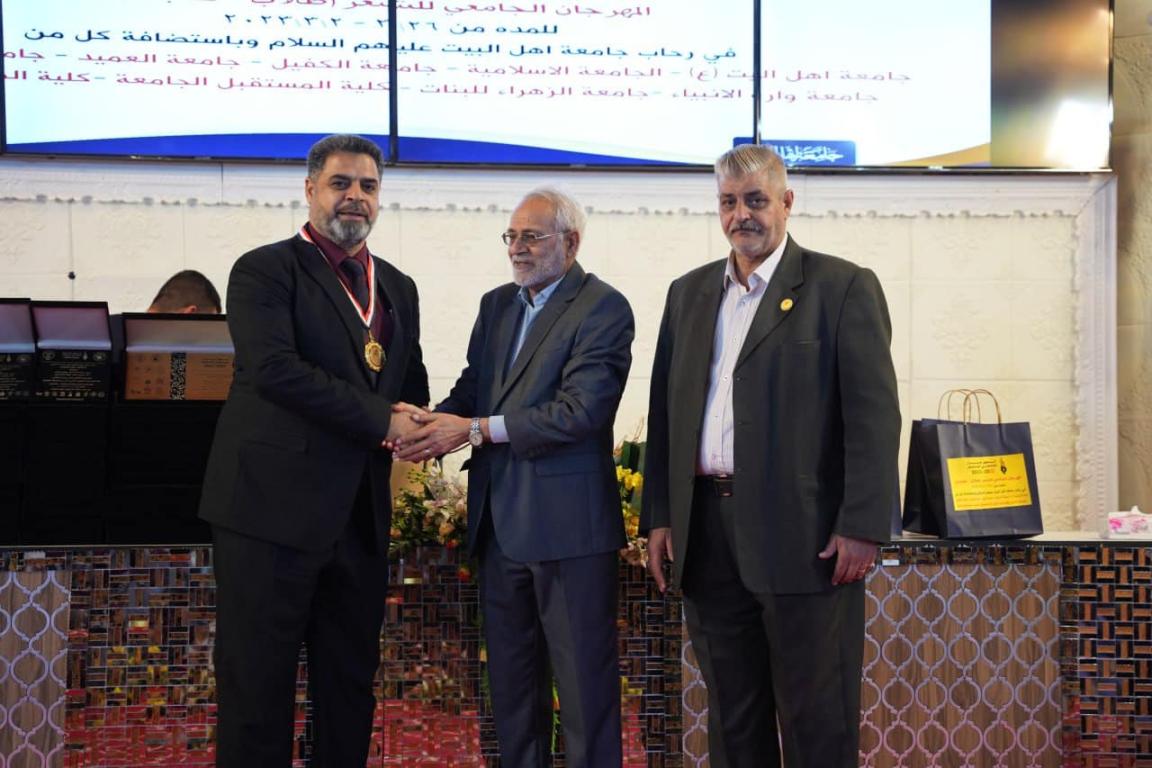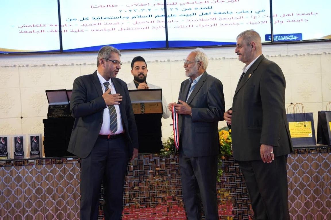 بحضور أ.د.حميد عبد جواد النجدي رئيس جامعة اهل البيت عليهم السلام والدكتور محسن القزويني مؤسس الجامعه وأعضاء اللجنه الوزاريه المكلفه بمتابعة تنفيذ النشاطات الطلابيه واللجنة الثقافيه ولجنة التحكيم تم اختتام فعاليات المهرجان الجامعي للشعر بدورته الرابعه والذي استمر لمدة أربعة أيام في رحاب جامعة اهل البيت عليهم السلام وباستضافة كل من : جامعة وارث الأنبياء وجامعة الزهراء للبنات وجامعة العميد وجامعة الكفيل والجامعة الاسلاميه وجامعة كلكامش وكلية المستقبل الجامعه وكلية الطف الجامعه بالإضافة إلى جامعة اهل البيت عليهم السلام وبمشاركة ٩٣ متسابق ومتسابقه من الشعراء يمثلون ٥٣ جامعه وكليه حكوميه واهليه..