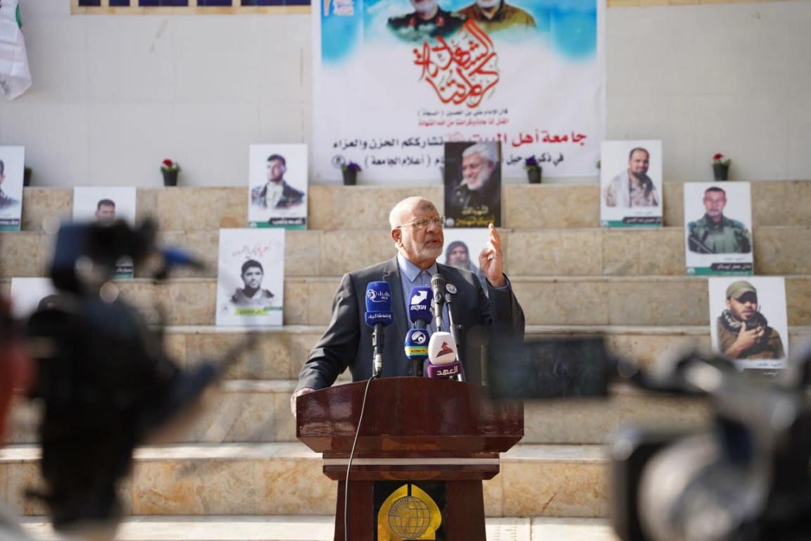 احتفت جامعة اهل البيت ع بذكرى استشهاد القائدين الهمامين ,( الشهيد القائد ابو مهدي المهندس وضيف العراق الشهيد القائد قاسم سليماني ،اللذين اغتيلا غدرا وبهتانا،،حيث اقامت وقفة تأبينية استذكارا لذلك اليوم الذي فجعت فيه الامة الاسلامية اجمع عندما طالتهم صواريخ الغدر الامريكية الصهيونيه،،وابتدا الحفل بقراءة سورة الفاتحة المباركه على ارواح شهداء الاسلام وشهداء العراق كافه ثم قرأ بعدها الاستاذ صادق القزويني مدير الاعلام ابياتا من الشعر استوحاها من واقعة الطف الاليمة ومن مواقف وبطولة اولاد الحسين ع وصحبه الابرار ،،بعدها القى السيد رئيس الجامعة الاستاذ الدكتور حميد النجدي كلمة فضح فيها الجرائم التي يقوم بها العدو الصهيوني الغاشم في غزة الصمود وكيف ارتكب ابشع صور القتل ولم يستثن كهلا ولا عجوزا ولا امرأة ولا طفلا من صواريخه الحقوده وقنابله الاثمة التي طالت الارض والحرث ودمرت كل ما هو حي ،وفي نفس الوقت لم نسمع من الحكام العرب سوى استنكارات خجولة وجبانه ولم يقف احد من العرب وقفة جادة لردع الغزاة سوى ابناء المقاومه من العراق العظيم ،،كما تحدث عن المخططات الامريكية الصهيونيه التي تريد بالعالم الاسلامي الذل والخنوع من خلال اغتيال قادة النصر الابرار وما هم سوى رجال مدافعين عن الارض والعرض والمقدسات ،ضد عدو غاشم محتل غاصب اتى من اقاصي البحار لاذلال العراقين الاحرار ولدعم الدواعش الانذال الذين عاثوا في الارض فسادا، ولولا وقفة المجاهدين الابطال من خلال تلبيتهم لنداء المرجعية الرشيده ،،لكان العراق قد استبيح من اقصاه الى اقصاه،،ثم القى بعدها الدكتور سعد السعدي مدير العلاقات في الجامعة كلمة اثنى فيها على المقاومين من ابطال الحشد الشعبي وكل من تصدى ولم يزل يتصدى للقوى الامريكيه الصهيونية واذنابهم من العملاء الخونه ،وضرورة تفعيل القوانين في مجلس النواب التي من شانها المحافظة على حرية العراق وكرامته وقدسية ارضه بالتعجيل في تفعيل الفقرات التي تخص طرد المحتل وعدم السماح لاية قوة اجنبية غاشمة في العمل في العراق ،ثم اختتم الاستاذ صادق القزويني مدير اعلام الجامعة الوقفة التأبينية بقراءة ابيات من الشعر العربي بعدها اعاد الحاضرون قراءة سورة المباركة الفاتحة مرة اخرى على روحي الشهيدين السعيدين وشهداء الاسلام كافة