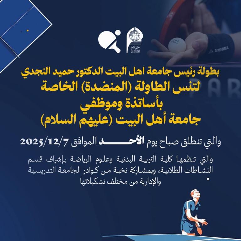Welcome الرئيسية تنس الطاولة يجمع كوادر جامعة أهل البيت: انطلاق منافسات بطولة داخلية يوم 7/12/2025 test@itc