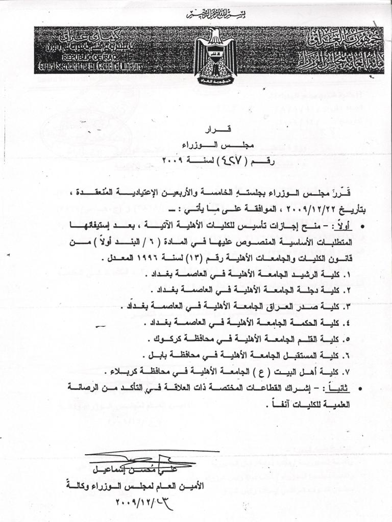 قرر مجلس الوزراء بجلسته (45) المنعقد بتاريخ 22/12/2009 منح جامعة أهل البيت عليهم السلام اجازة التأسيس