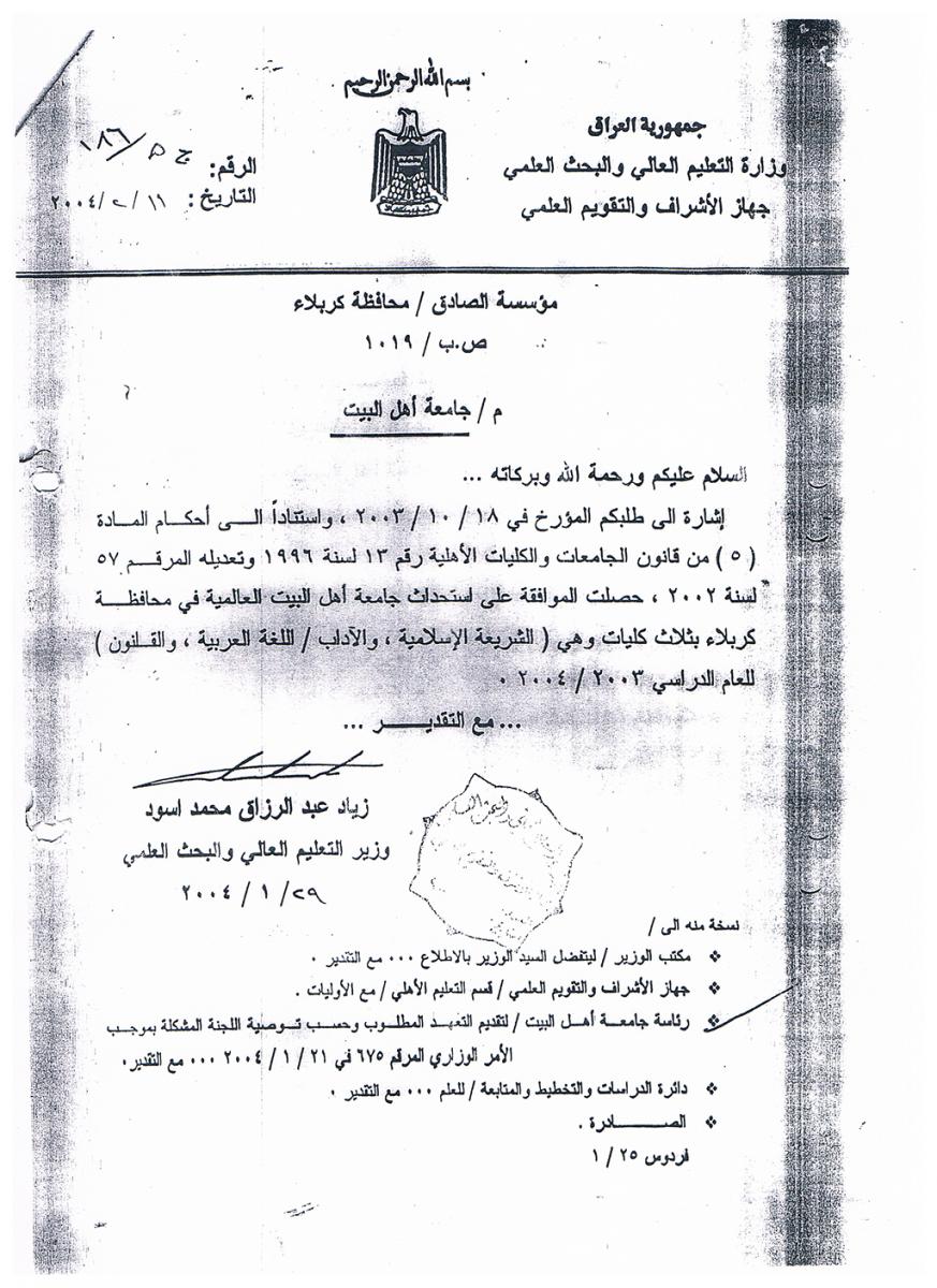موافقة معالي وزير التعليم العالي والبحث العلمي الأستاذ الدكتور زياد عبد الرزاق أسود على تأسيس جامعة أهل البيت عليهم السلام بالكتاب المرقم ج هـ / 186 في 11/2/2004