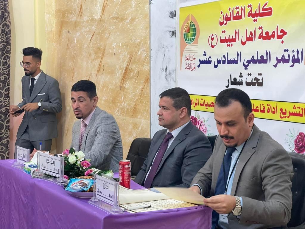 جانب من مؤتمر كلية القانون في جامعة اهل البيت ضمن فعاليات الاسبوع العلمي و الثقافي والذي اقيم تحت عنوان ( فلسفة التشريع اداة فعالة في مواجهة التحديات الراهنة ) بحضور عميد كلية القانون الاستاذ الدكتور حسن حنتوش و جمع من اساتذة الجامعات و الشخصيات القانونية البارزة في العراق و عدد من طلبة الكلية