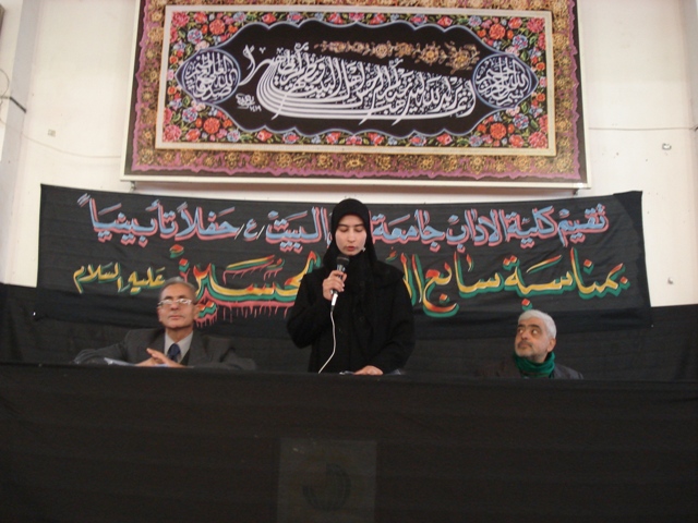 ثم قدم الدكتور عدنان محمد آل طعمة عميد كلية الآداب بحثاً موجزاً بعنوان (مرائي الحسين في الأندلس) بعدها قدّم الباحث خليل الطيّار التدريسي في قسم الصحافة بحثاً بعنوان (مفهوم البطل التراجيدي في الدراما – الحسين رمزاً للبطولة الإنسانية) وقدم الباحث الدكتور خضير عباس درويش التدريسي في قسم اللغة العربية بحثاً بعنوان (ملحمة الطف في المسرح العراقي الحديث) ثم قدم الباحث الدكتور محمد عبدفيحان رئيس قسم الصحافة دراسة بعنوان (الملحمة الحسينية وأهدافها ونتائجها في الإعلام الإنساني) وقرأت في الاحتفال عدة قصائد للشعراء السيد محمد رضا القزويني والسيد صادق القزويني والطالبلة هدى عمر الخفاجي من كلية الإمام الحسين للخطابة وعدد من طلبة جامعة أهل البيت عليهم السلام – كلية الآداب حيث جسدت كلماتهم وقصائدهم محبة الحسين وأهل البيت الأطهار وتناولت بالتمجيد والتعظيم القيم النبيلة والمبادئ السامية التي رسخها أبوعبدالله الحسين بدمائه الزكية على رمضاء كربلاء لتشعّ نوراً وفيضاً سماوياً على الدنيا كلّها..