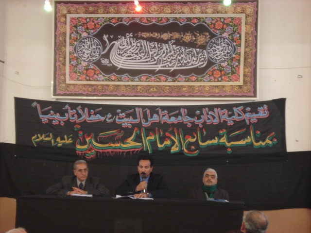 تحت شعار ((الحسين بيرق السماء في الأرض وبيرق الأرض في السماء)) أقامت كلية الآداب بجامعة أهل البيت في كربلاء المقدسة احتفالاً تأبينياً كبيراً لمناسبة اليوم السابع لاستشهاد أبي الأحرار الإمام الخالد الحسين بن علي عليهما السلام على قاعة الجامعة.. وأقيم الاحتفال تحت عنوان (ملحمة الطف الحسينية الخالدة في المسرح الإنساني) وقد تضمّن الاحتفال عدة بحوث وكلمات وقصائد بدأت بكلمة للسيد رئيس الجامعة الأستاذ الدكتور عباس حسين جواد الحميري أكد فيها على استلهام القيم والمبادئ السامية التي استشهد من أجلها سبط الرسول الأعظم وهي قيم الحق والعدل والإصلاح وقدم في سبيلها الولد والمال والنفس وكل ما يملك من أجل الله والخير والحرية ومقارعة الباطل والفساد والطغيان..