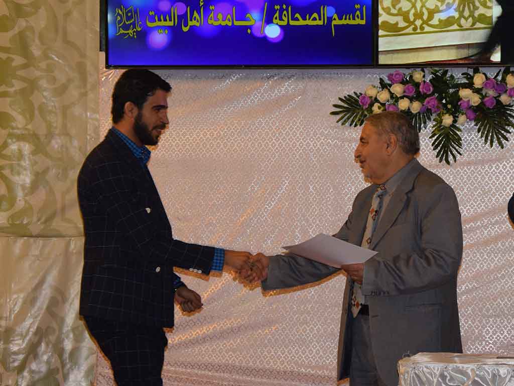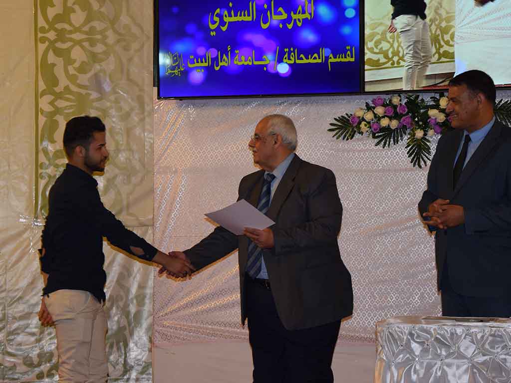 برعاية الدكتور محسن القزويني مؤسس جامعة أهل البيت (ع) أقام قسم الصحافة اليوم السبت مهرجانه السنوي الذي شمل تقديم عرض مفصل من قبل رئيس قسم الصحافة بشأن نشاطات قسم الصحافة للموسم الدراسي 2016- 2017 والتي شملت إنتاج أفلام تسجيلية منها فلم (جامعة العطاء) الذي حاز على الجائزة الأولى كأحسن مشروع تخرج، وتقارير تلفزيونية متنوعة أعدها الطلبة أنفسهم بدعم وتوجيه من التدريسيين.