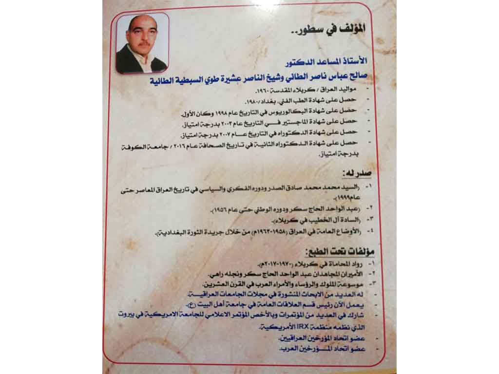 نشر دار الثقافة والاعلام في بابل كتابا لممثل الهيأة التدريسية في مجلس جامعة اهل البيت عليهم السلام ومقرر قسم الصحافة في كلية الاداب الاستاذ المساعد الدكتور صالح عباس ناصر الطائي حيث كان الكتاب تحت عنوان ( ابحاث في تاريخ العراق المعاصر 1919-1963 ) رقم الايداع في دار الكتب والوثائق ببغداد (385) لسنة 2018 ويتكون الكتاب من بابين الاول تحت عنوان كربلائيون في تاريخ العراق المعاصر و يتكون من ستة فصول اما الباب الثاني فهو بعنوان ابحاث متفرقة من تاريخ العراق المعاصر و يتكون من سبعة فصول