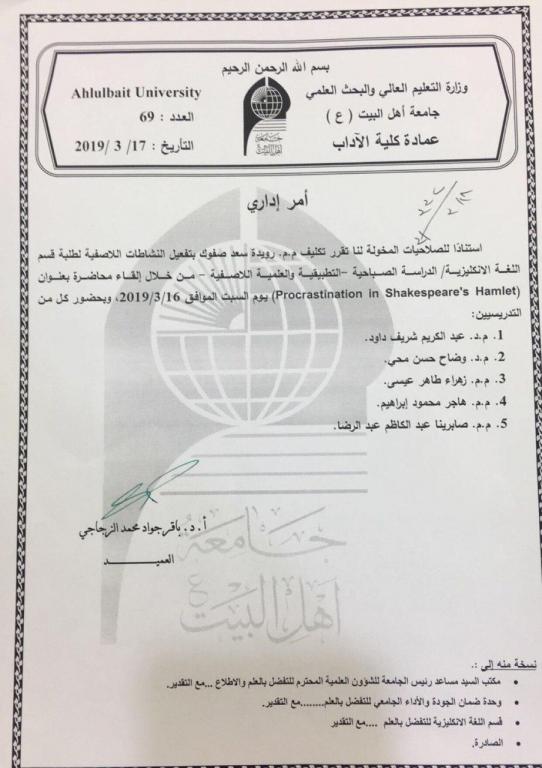 قدمت التدريسية م.م رويدة سعد صفوك في قسم اللغة الانكليزية -كليه الاداب محاضرة بعنوان(procrastination in shake spear's hamlet)  و هي جزء من النشاطات العلمية اللاصفية يوم السبت الموافق 16/3/2019وبحضور رئيس قسم اللغة الانكليزية وعدد من اساتذة القسم