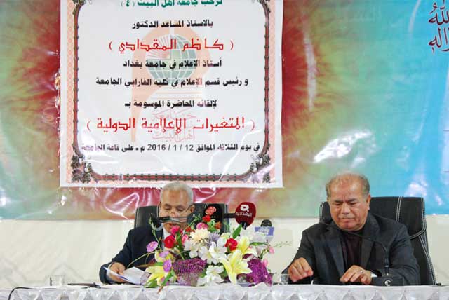 استضافت جامعة اهل البيت عليهم السلام يوم الثلاثاء الماضي استاذ الاعلام الدكتور كاظم المقدادي. والقى المقدادي محاضرة بعنوان (متغيرات الاعلام في العالم ) سلط فيها الضوء على المراحي التاريخية لتطور الاعلام و تأثيره على الرأي العام و اتساع حركته و تعدد منافذه.