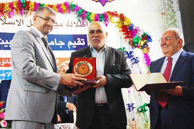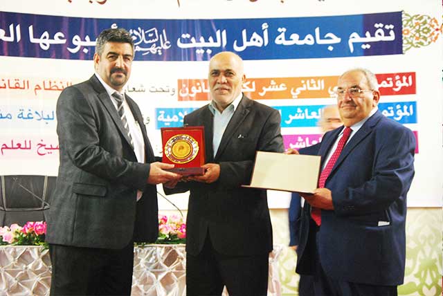 وفي نهاية الجلسة الافتتاحية قدم السيد رئيس الهيئة المؤسسة للجامعة الدكتور محسن القزويني شهادة تقديرية مع درع الجامعة لممثل معالي الوزير ثم قام ممثل معالي الوزير بتقديم الشهادات التقديرية ودروع الجامعة لعدد من رؤساء الجامعات وعمداء الكليات وعدد من الشخصيات العلمية.