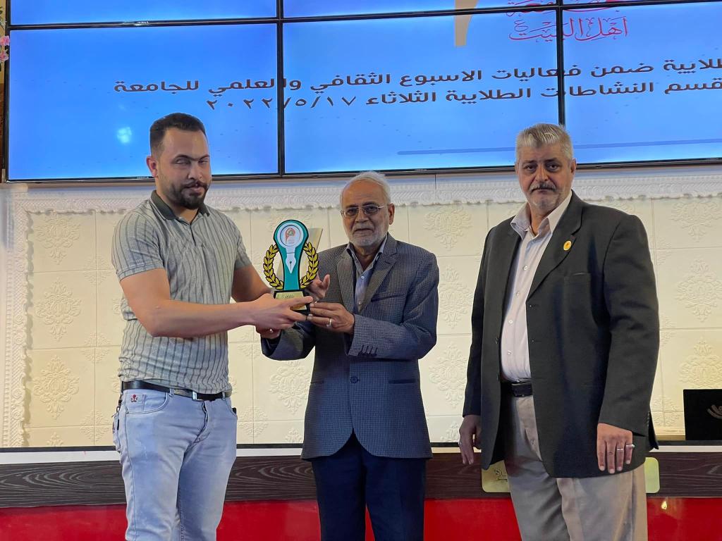 أعقب ذلك تقديم دروع الامتنان من قبل الطلبه إلى الأستاذ الدكتور حميد النجدي رئيس الجامعه والأستاذ الدكتور محسن القزويني مؤسس الجامعه ليتم بعدها تقديم الجوائز والدروع والشهادات التقديرية على الطلبه المشاركين في مختلف النشاطات الطلابية على مدار العام الدراسي