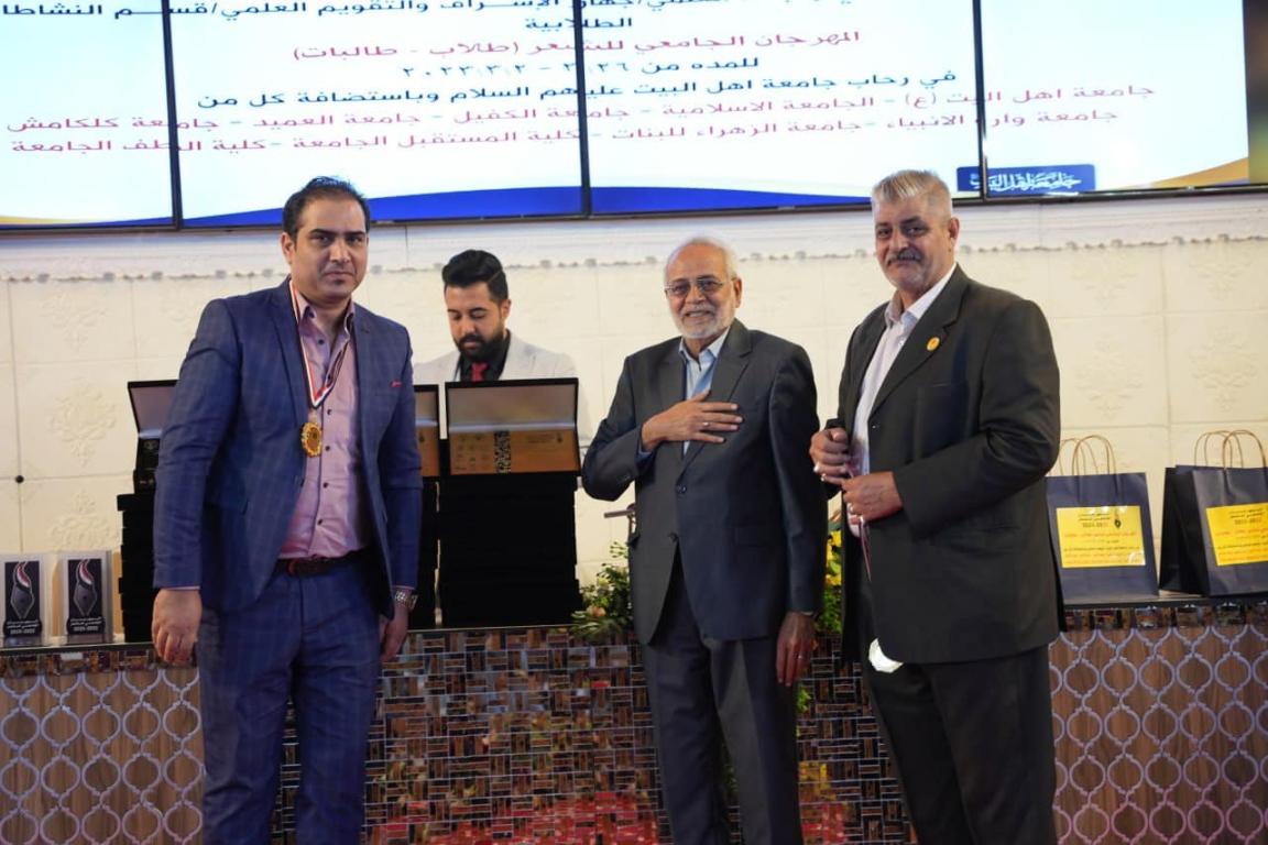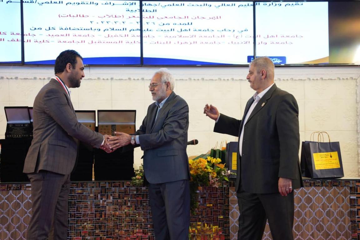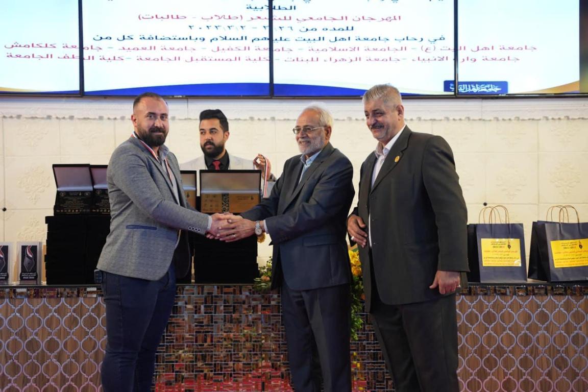 بحضور أ.د.حميد عبد جواد النجدي رئيس جامعة اهل البيت عليهم السلام والدكتور محسن القزويني مؤسس الجامعه وأعضاء اللجنه الوزاريه المكلفه بمتابعة تنفيذ النشاطات الطلابيه واللجنة الثقافيه ولجنة التحكيم تم اختتام فعاليات المهرجان الجامعي للشعر بدورته الرابعه والذي استمر لمدة أربعة أيام في رحاب جامعة اهل البيت عليهم السلام وباستضافة كل من : جامعة وارث الأنبياء وجامعة الزهراء للبنات وجامعة العميد وجامعة الكفيل والجامعة الاسلاميه وجامعة كلكامش وكلية المستقبل الجامعه وكلية الطف الجامعه بالإضافة إلى جامعة اهل البيت عليهم السلام وبمشاركة ٩٣ متسابق ومتسابقه من الشعراء يمثلون ٥٣ جامعه وكليه حكوميه واهليه..