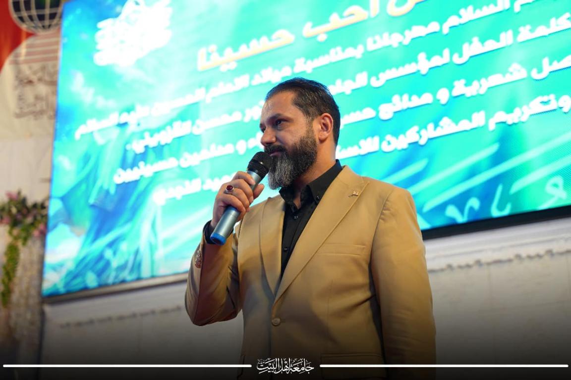 بعدها اعتلى المنصة الرادود الحسيني حسين العكيلي ليلهب قلوب الحاضرين بالفرحة والسرور ،وليرددو معه اناشيد في عشق وحب الامام الحسين عليه السلام ثم القى الاستاذ الدكتور حميد النجدي كلمة بين خلالها المقولة الخالدة ( احب الله من احب حسينا ) وكيف ان حب الحسين هو حب لله عز وجل و كيف حثنا الرسول الاكرم بضرورة التمسك بعترته الطاهرة من خلال مقولته ( قل لا اسٱلكم عليه اجرا الا المودة في القربى )