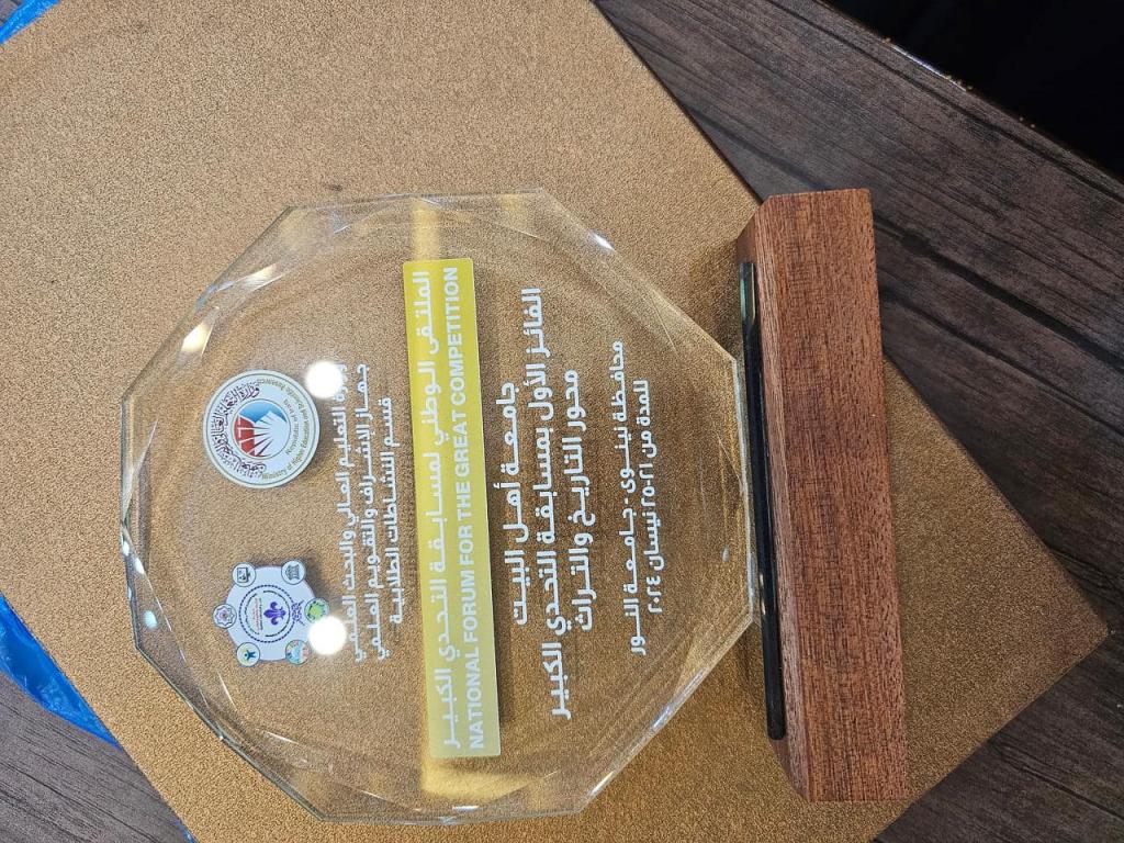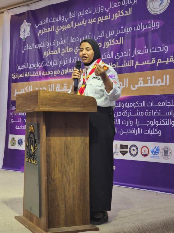 بحضور السادة أعضاء اللجنة الوزارية المكلفة بالإشراف على تنفيذ النشاطات الطلابية والسبد ممثل ممثل جمعية الكشافةً العراقية والسيد رئيس جامعة الفراهيدي والأساتذة رؤساء الوفود والطلبة المشاركين تم مساء يوم الاربعاء 4/24 اختتام فعاليات الملتقى الوطني لمسابقة التحدي الكبير في محافظة نينوى حيث استهل الحفل بترديد النشيد الوطني وقراءة سورة الفاتحة على ارواح شهداء العراق وفلسطين ليتم بعدها توزيع الجوائز على الفرق الفائزة المشاركة في المحاور الخمسة التي نظمت على اساسها المسابقة ليتم الإعلان عن فوز فريق جامعة أهل البيت عليهم السلام بالمركز الاول في محور التاريخ والتراث من قبل لجنة التحكيم الكشفية الدولية واللجنة المحلية واشاد القائمون على الملتقى بالمستوى المتميز للفريق من خلال مشاركته في الفعاليات التي اقيمت للمدة من 21 - 25 /4 / 2024 في رحاب جامعة النور و غابات ام الربيعين الموصل الحدباء وبمشاركة الفرق الفائزة بالمحاور الخمسة للمسابقة ويذكر بان الملتقى الوطني كان قد خصص للفرق الفائزة من بين اكثر من 70 جامعة وكلية حكومية وأهلية علما بان المسابقة كانت من فعاليات الفصل الدراسي الاول حيث استمرّ الاعداد للمادة المقدمة فيها لمدة ثلاثة اشهر ومثل فريق الجامعة كل من :-